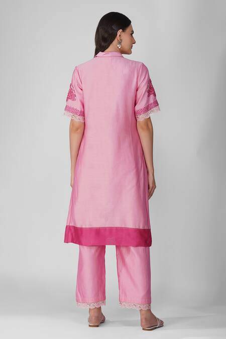 Pink tunic featuring a Mandarin collar, half sleeves, and embellished with hand embroidered thread flowers and sequin placement. Paired with matching pants that have lace embroidered hems.