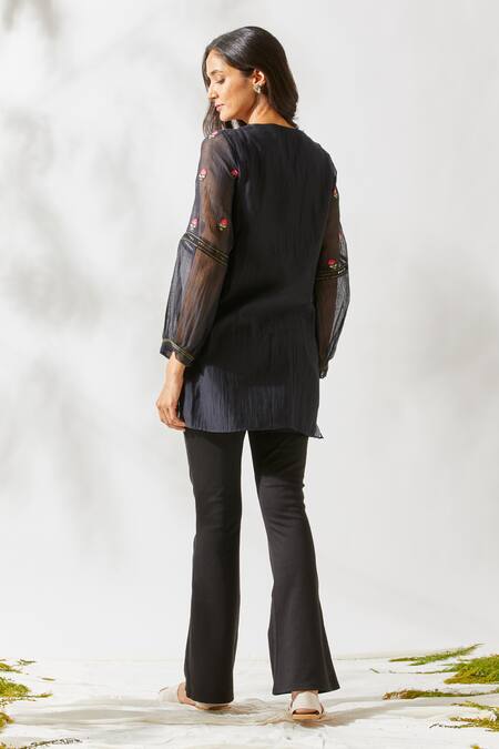 Black short tunic with front tie-up & floral embroidered puff sleeves.