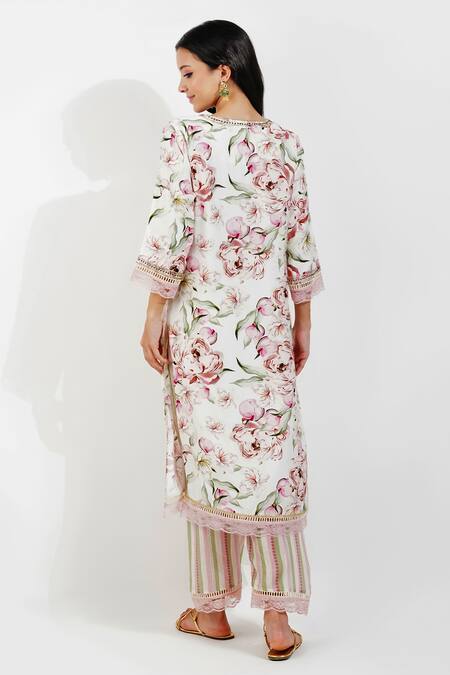 Ivory kurta featuring vintage floral print with sequin border and lace work. Paired with stripe print pant and scallop border embellished dupatta.