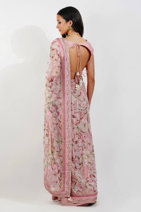 Pink saree featuring floral stripe print with sequin embroidered scallop border. Comes with an unstitched blouse piece for customization.
