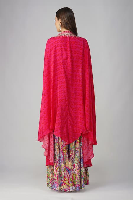Rani pink crepe cape featuring an all-over leaf print with sequin, bead, crochet lace, and gota embellished border. Paired with a multi-color leaf print gharara and padded blouse adorned with sequin drop tassels.