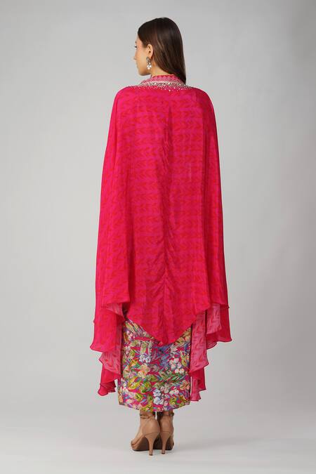Pink Crepe Printed And Embellished Leaf Cape Open Skirt Set