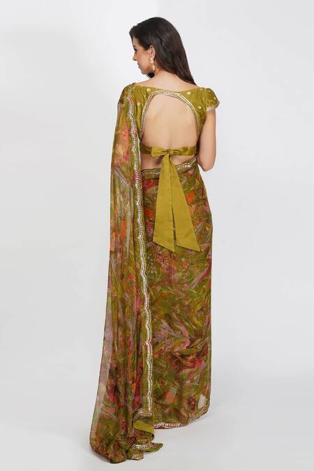 Green saree with all-over floral print and delicate sequin embroidery at the border. Comes with sleeveless blouse.
