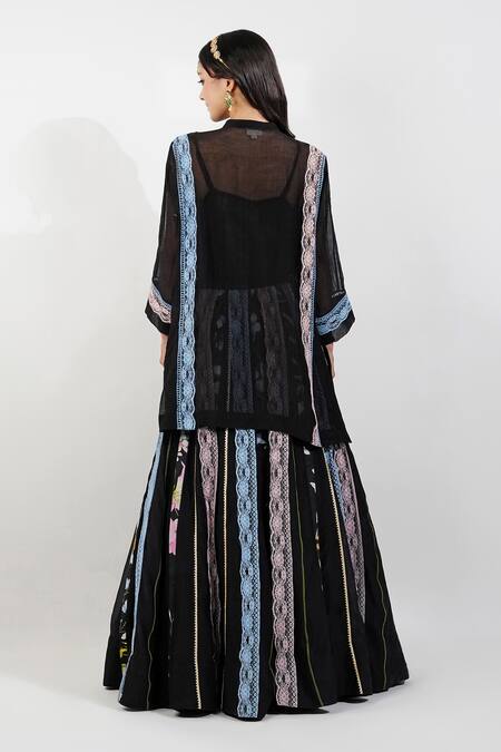Black lehenga featuring lace embellishment and floral print. Paired with a panelled embroidered kurta and plain slip.