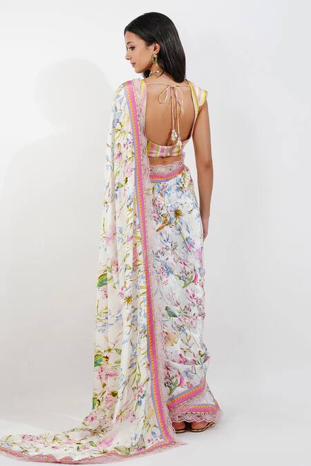Ivory saree featuring a summer floral print with lace embellished scallop border. Includes an unstitched blouse piece for customization.