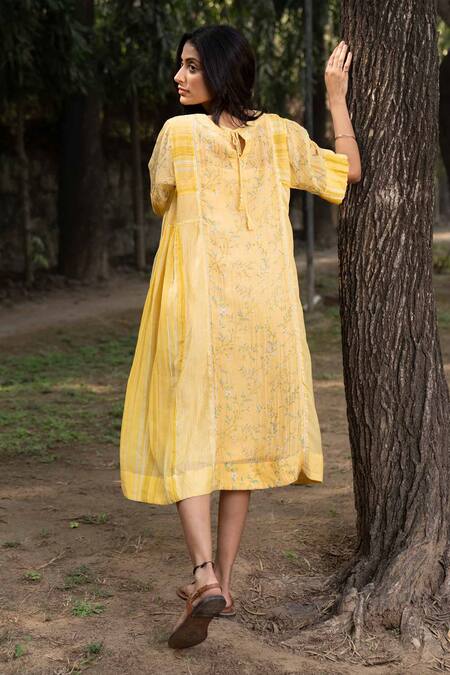 Yellow Handloom Cotton, Silk Embroidery Boat Neck Floral Pattern Gathered Dress