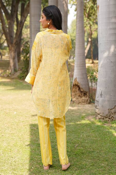 Yellow shirt in handwoven cotton silk featuring drop shoulder sleeves and a scallop hem. Paired with an inner slip showcasing a hand-painted floral pattern with kantha and lace work highlights.