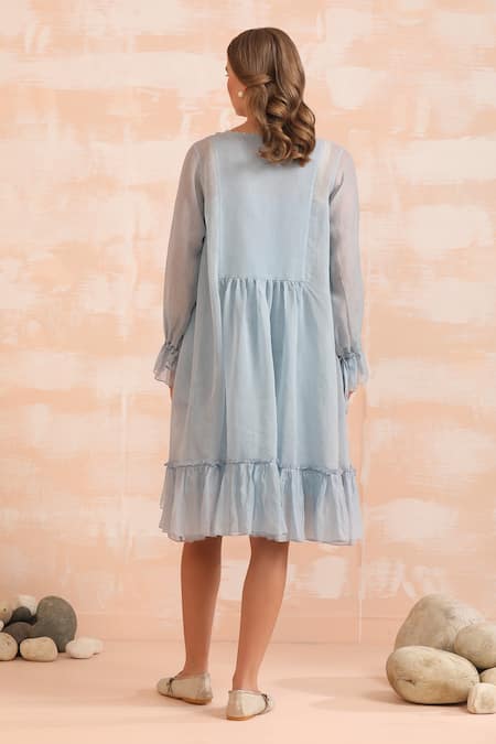 Blue handwoven cotton silk midi dress featuring hand embroidery and a flared fit. Paired with a slip.