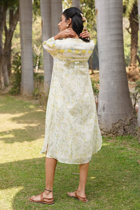 Off white handwoven cotton silk dress featuring a frill neck and puff sleeves. Paired with an attached inner slip and adorned with floral stripe patterns, pearl, and kantha work.