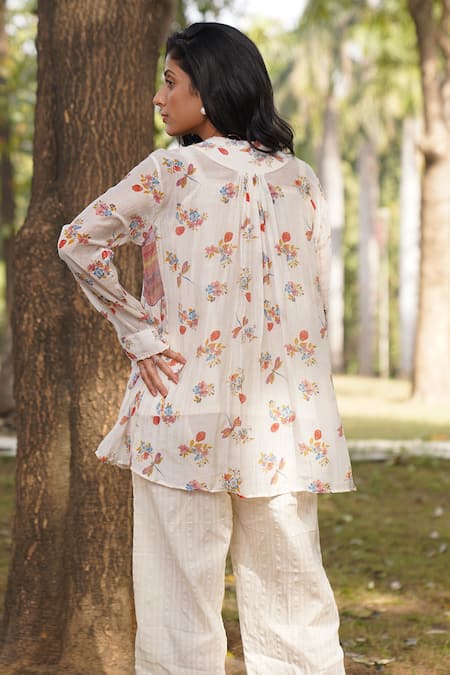 Off white handwoven cotton silk peplum top featuring all-over ladybug, dragonfly, and floral pattern hand painting with kantha & pearl embroidered highlights. Paired with a slip for added comfort.