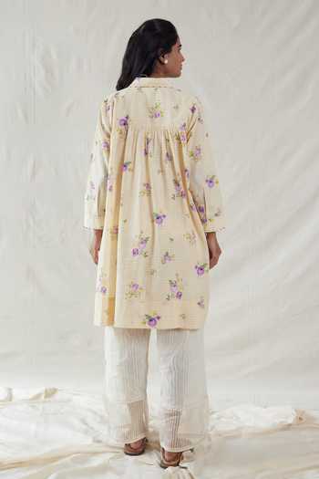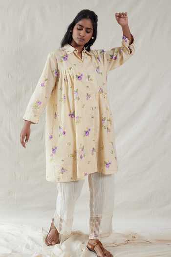 Yellow handwoven cotton silk kurta with floral print & hand-painted details.