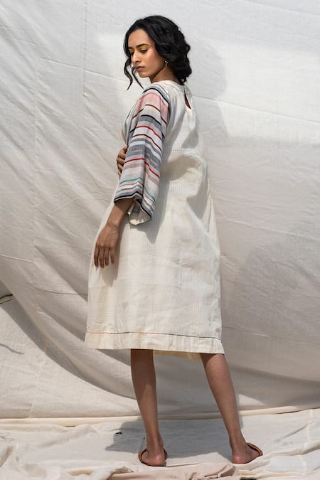Ivory dress with checkered motifs, placement floral embroidered motifs, striped detail & side gathers. Paired with inner.