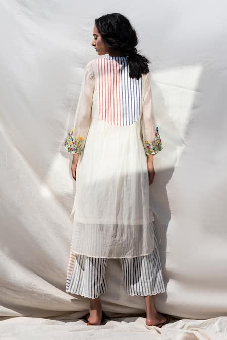Ivory kurta with striped detail & floral embroidered sheer sleeves. Paired with inner.