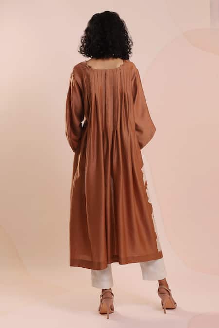 Brown chanderi overlay featuring lantern sleeves and a V neck