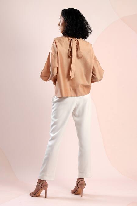 Beige Chanderi Embroidery High Neck Patch Work Lantern Sleeve Top