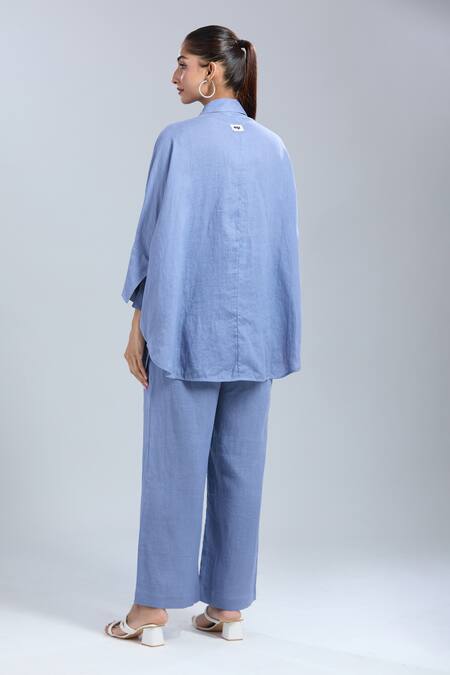 Blue long shirt featuring crystal grid embellishments on the front. Paired with matching blue wide-leg pants.
