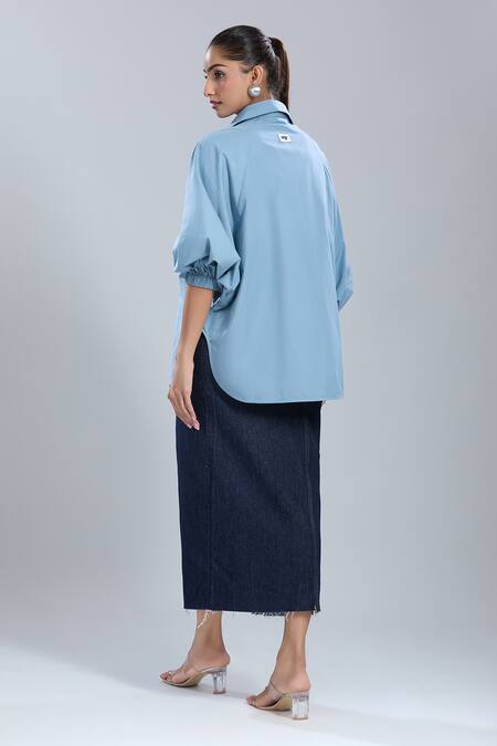 Blue Embroidery Collared Stem Polo Batwing Shirt