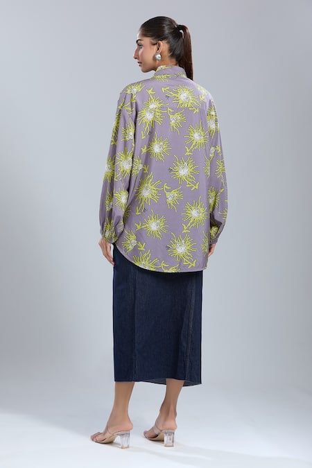 Tie-up detail with contrasting black laces, Unique floral pattern in vibrant colors, Long sleeves with buttoned cuffs