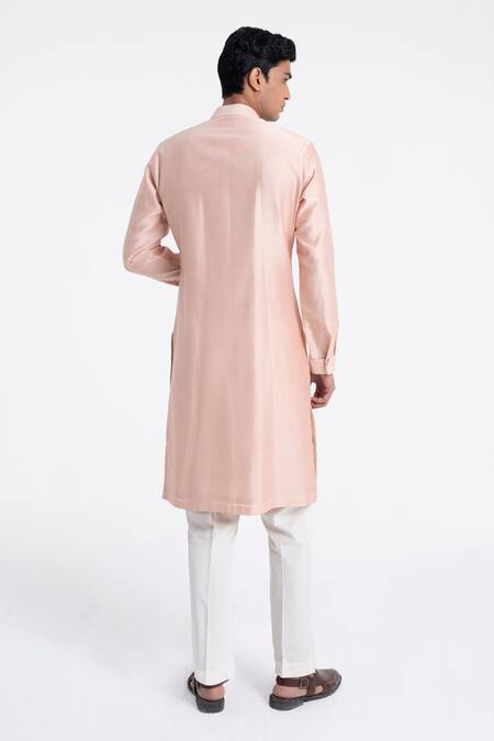 A sandrose chanderi kurta featuring a classic placket and contemporary motif embroidery. It is paired with a tericotton pant style pyjama.