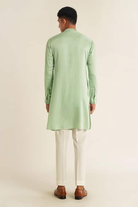 Green kurta featuring a band collar, full cuff sleeves, and side slits. Paired with a pant cut pyjama, this set is made from modal satin and includes an asymmetric overlap panel with attached yoke panels.
