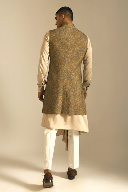 Ochre textured long Nehru jacket with floral printed motifs, patch pocket & front potlis.