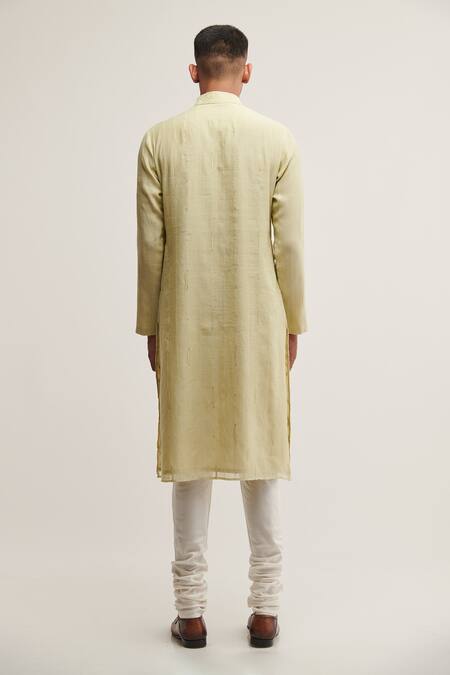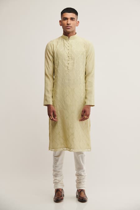 Pale mint kurta with geometric embroidery highlighted in sequin work. Paired with churidar.