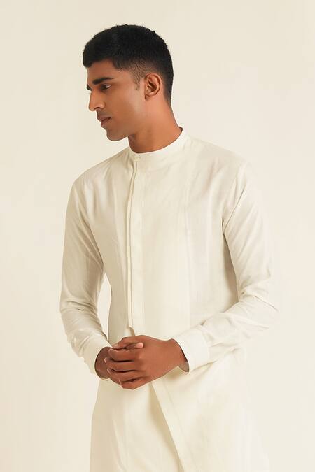 Ivory kurta featuring full sleeves, band collar, and asymmetric front button placket