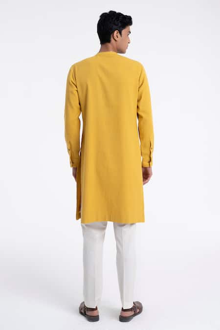 A marigold kurta crafted from textured cotton silk features multiple curved panels, a classic round collar, and a buttoned placket. It is paired with terricotton pant style pyjama.