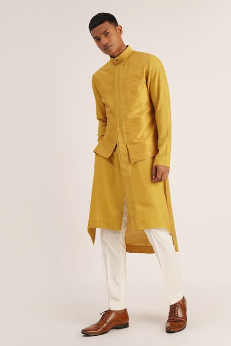 Marigold hybrid kurta in raw silk and cotton silk with diagonal embroidery and centre placket. Paired with pant cut pyjama.