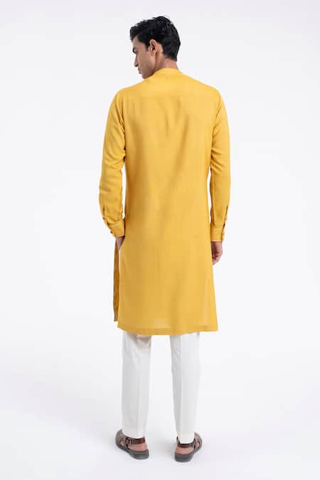 A marigold front open high neck kurta crafted from cotton silk, featuring diagonal line embroidery. It is paired with a terricotton pyjama pant.
