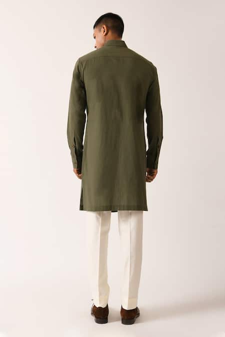 Olive kurta with double flap detailing, concealed placket, cuffed sleeves & side pocket. Comes with white pant cut pyjama.