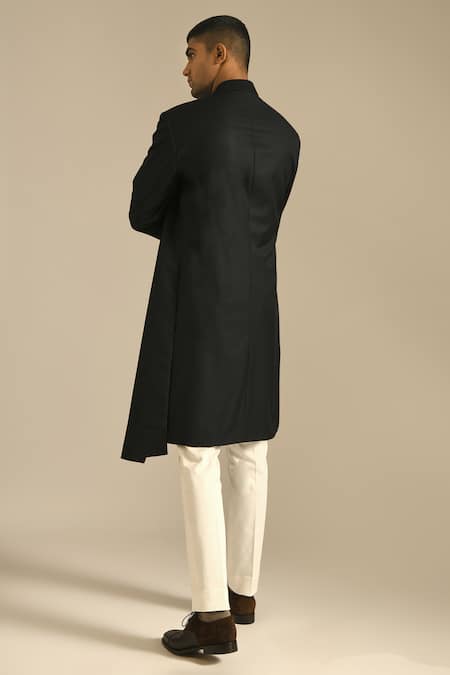 Black sherwani with patch pocket, overlap detail & asymmetric panels. Paired with pant.