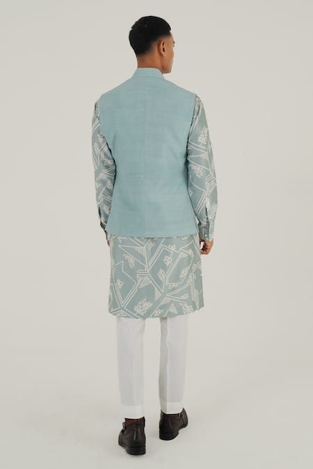 Powder blue silk open jawahar jacket featuring thread embroidered geometric motifs and an attached inner panel