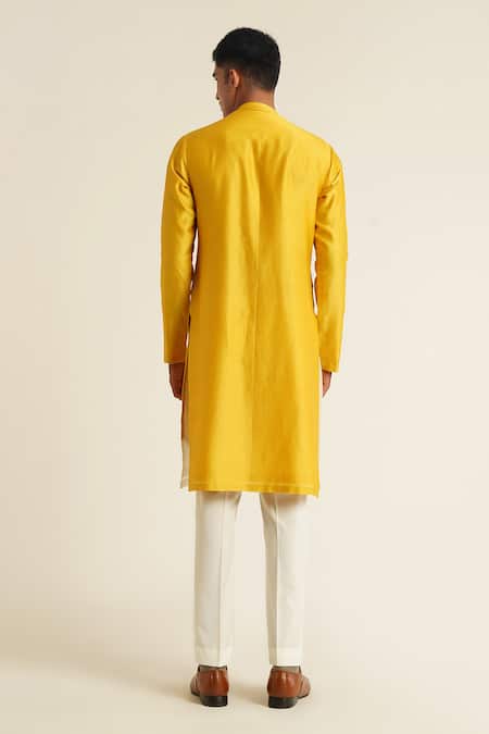 Marigold kurta featuring a band collar, full cuff sleeves, and side slits. Paired with a pant cut pyjama, it showcases an abstract print with asymmetric cut overlap panels.