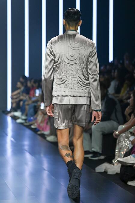 Grey satin quilted vest featuring a collar and full sleeves. Paired with a satin blazer and shorts, complemented by a green tunic shirt.