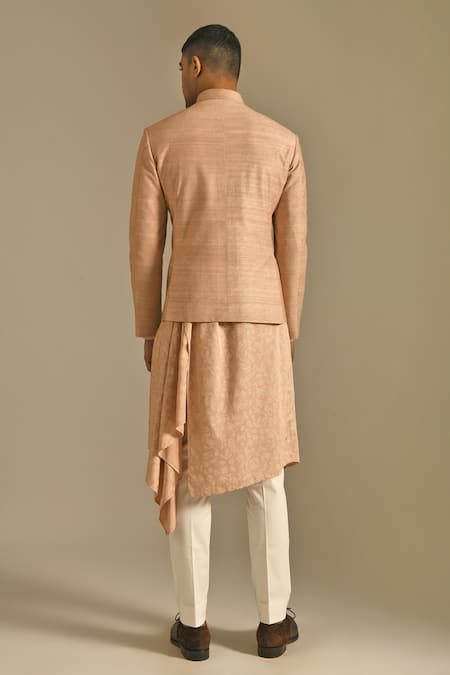 Pink dust textured bandhgala with button placket collar, dori & thread work detail.