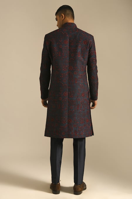 Black sherwani with floral embroidered motifs, front button placket & patch pocket. Paired with pant cut churidar.