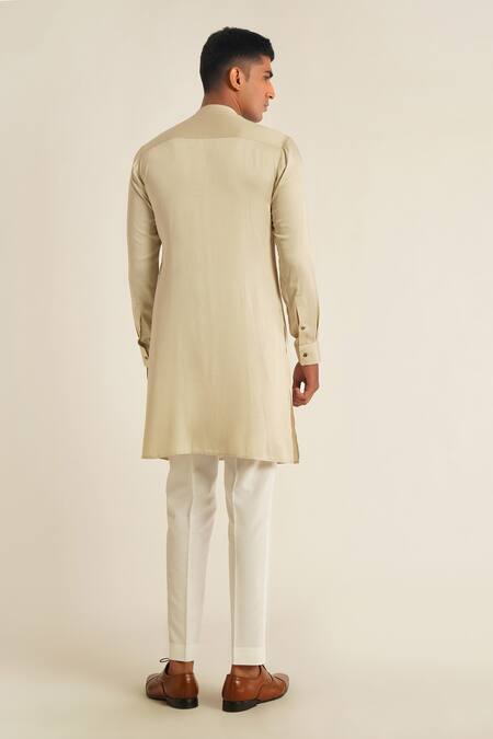 Beige modal satin kurta featuring a band collar, side button placket, and asymmetric overlap panel with pleated details. Paired with a pant cut pyjama for a complete look.