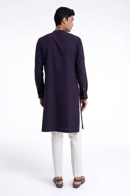 A midnight purple kurta crafted from textured cotton silk, featuring multiple curved panels and a classic round collar with a buttoned placket. It is paired with terricotton pant style pyjama.