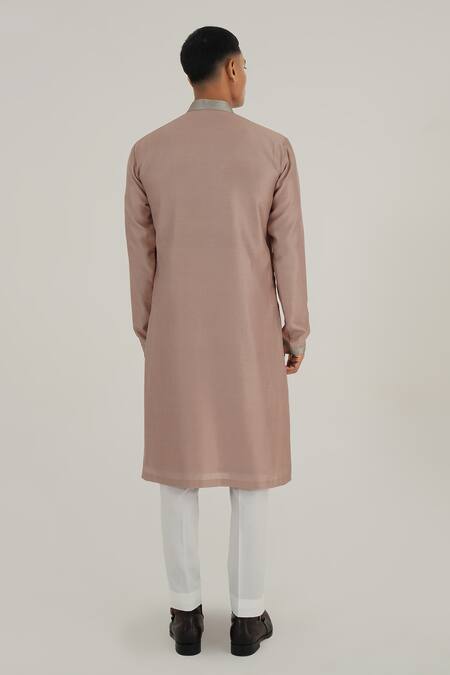 Onion pink kurta featuring stitchline thread embroidery and a mandarin collar. Paired with matching pants made from cotton silk Chanderi fabric.
