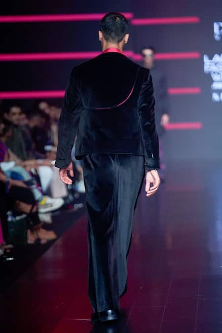 Black velvet jacket featuring a front open neckline and full sleeves with button detailing. Paired with matching velvet trousers for a cohesive look.