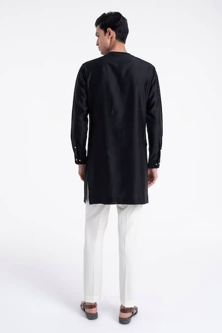 A black silk kurta features zari embroidery on the shoulder and chest, designed with a curved placket and side panel. It is paired with a terricotton pant style pyjama.