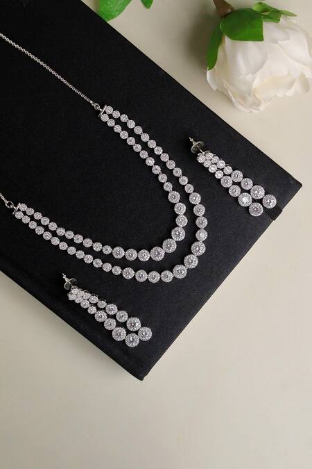 Rhodium plated layered necklace with white cubic zirconia stone embellishment. Comes with earrings.