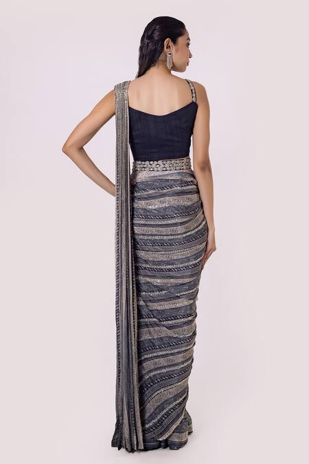 Grey black diamond pattern pre-draped saree with sequins and cutdana embellished border. Comes with crystal embellished blouse and belt.