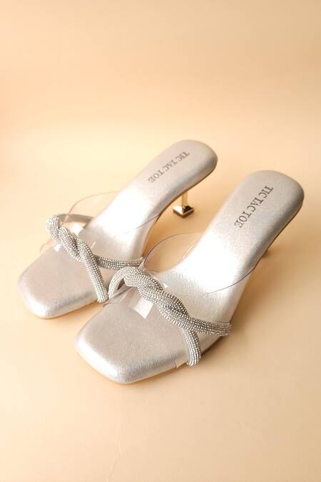 Silver faux leather kitten heels featuring transparent strap layered with diamond embellished twisted cords