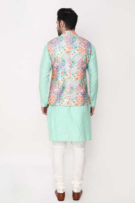 Multi-colored bundi jacket featuring zari embroidery and digital prints. Paired with a sea green kurta and off-white churidar.