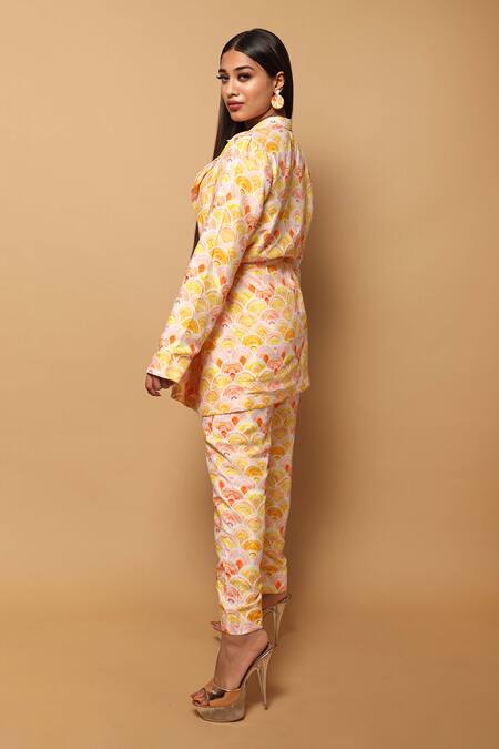 Ahi Clothing_Yellow Crepe Digital Print Lapel Collar Jacket And Pant Set_Online_at_Aza_Fashions
