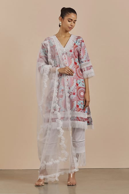 Lace trims on neckline, cuffs, and hemline, Crochet lace trim detailing on kurta, Lace applique embroidery on dupatta