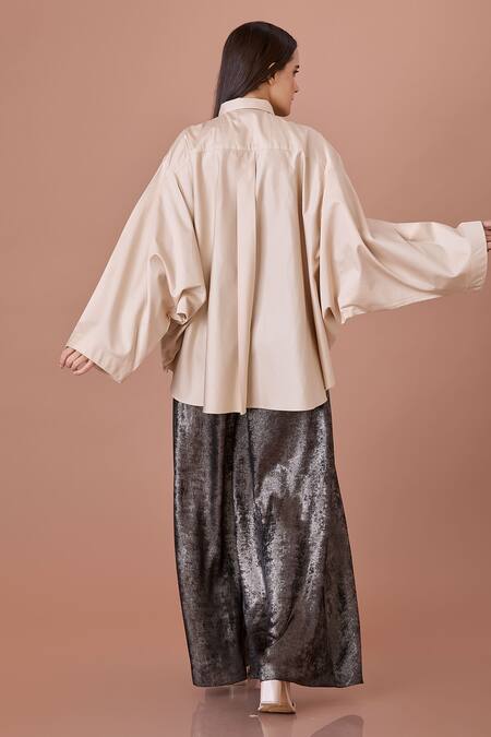 Beige shirt featuring batwing sleeves and collared neckline with green organza thread embroidery
