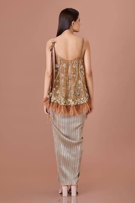 Brown top featuring sweetheart neckline with strap sleeves and embellished with cutdana, pearls, and sequins